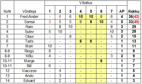 Lõpptulemuse arvutamisel läheb arvesse iga võistleja n-2 (n= võistluste koguarv) parimat tulemust. Teisisõnu arvutatakse maha kaks kehvemat tulemust. Võrdsete tulemuste korral saab parema koha see võistleja, kellel on rohkem esikohti, kui on võrdselt, siis teisi kohti jne.